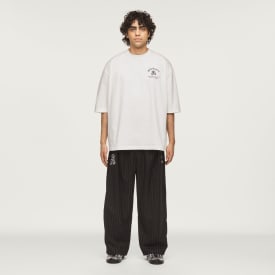 Pantalonii de trening cu dungi subțiri Chavarria sunt confecționați din stofă premium pentru calitate și confort excepționale. Partea de jos asigură volum generos pentru picioare, cu pliuri duble pentru și mai mult volum. Detaliile funcționale includ talia cu bandă elastică și cu șnur, 2 buzunare laterale cu fermoar și un buzunar la spate pe partea dreaptă a purtătorului. Marca este indicată de sigla Trefoil dublă, brodată pe coapsa stângă. Pe coapsa dreaptă este brodat un motiv grafic LA, iar pe centrul taliei, în față, este cusută o etichetă Willy Chavarria.